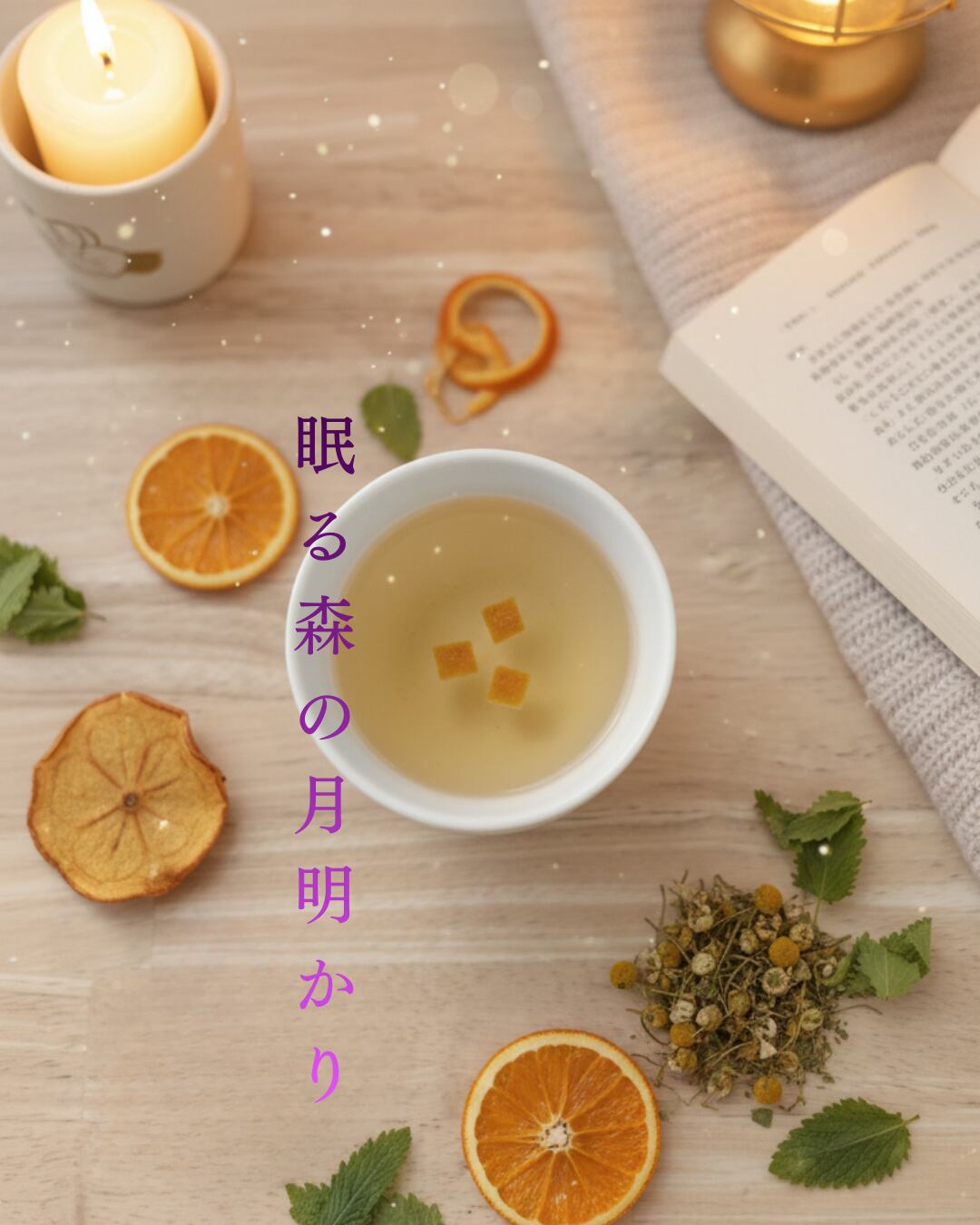 カモミールの甘さと、レモンバームの緑。合歓皮の余白に、蝦夷ウコギの深みが重なり、オレンジピールが小さな光を落とします。
